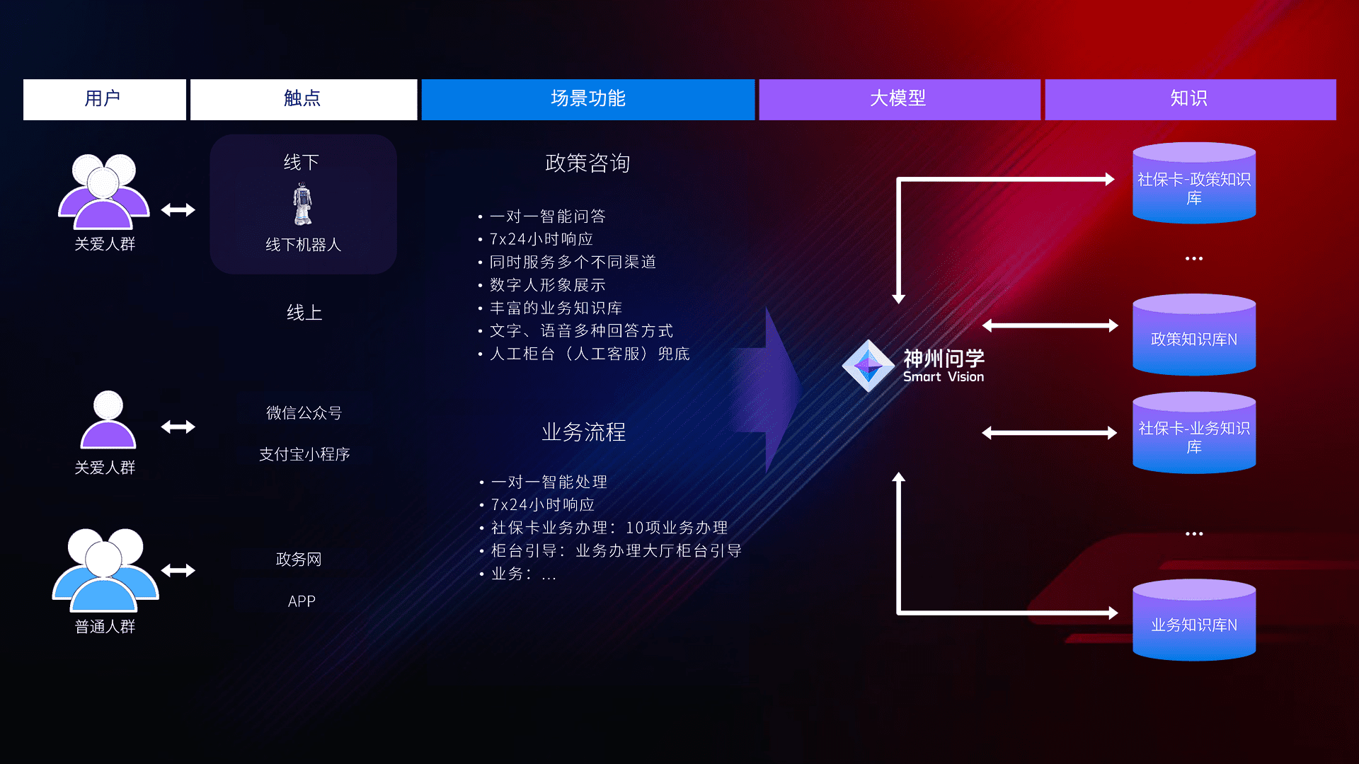 • 线上线下全覆盖:线上提供微信公众号、、、、支付宝小程序、、、政务网、、、app多种渠道,,,,与线下机器人形成完整服务体系。。。。