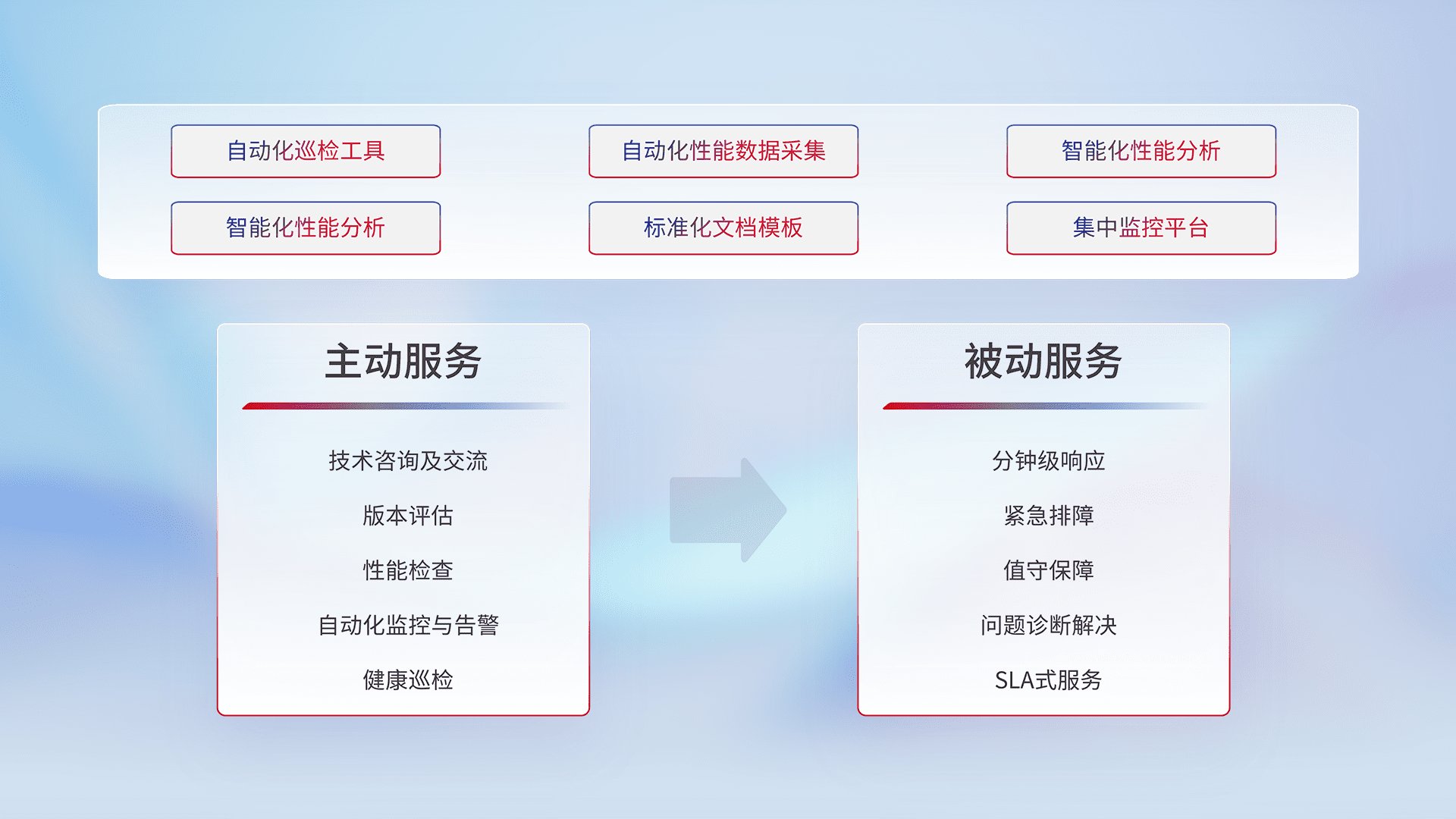 智能化工具和标准化文档,,,,保障服务质量,,,提供主动服务(包含技术咨询、、、版本评估、、、性能检查、、自动化监控与告警、、、健康巡检)和被动服务包含(分钟级响应、、、、紧急排障、、值守保障、、问题诊断解决、、、、SLA服务)。。。。